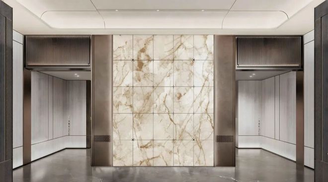 酒店式精妆双大堂设计,挑高敞阔格局,引入造型背景墙,金属与石材结合,点滴之间皆为金茂匠心。专属电梯厅,高规格入户仪式。