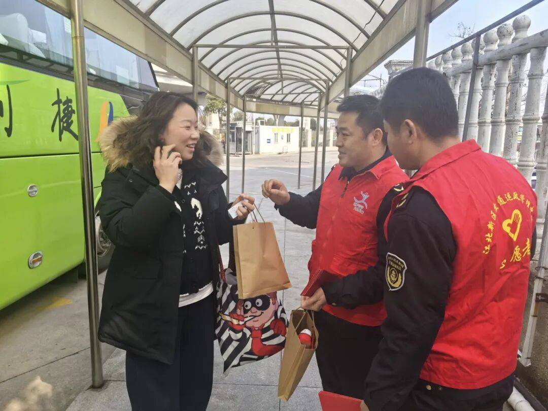 江北新区建设与交通局工作人员组成志愿者团队前往新区葛塘客运站开展春运志愿服务,送上新春祝福。