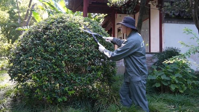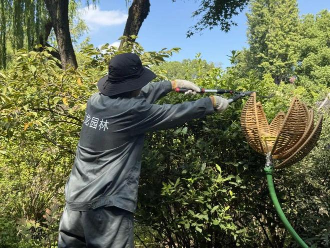 高温时节是植物生长的旺盛期,枝条修剪也是一项必不可少的工作。园内,绿化养护工人们手持绿篱剪和高枝剪,按照植物的生长习性,精细化修剪枝叶。