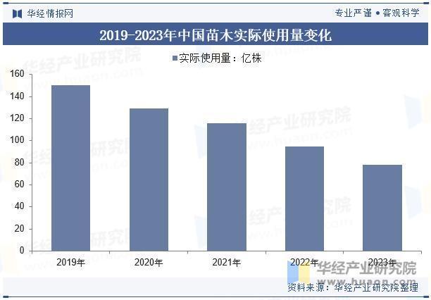 数据显示,中国苗木行业实际使用量呈现下降态势,从2019年的150亿株下降至2023年的78亿株,未来随着行业苗木的质量上涨,预计实际使用量开始上涨,未来中国苗木行业需求旺盛,带动行业高质量发展。